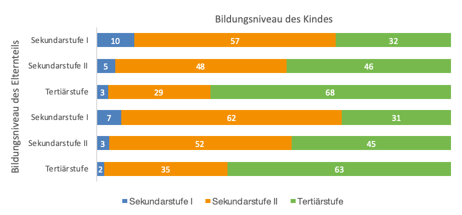 Das Bildungsniveau der in der Schweiz lebenden Personen wird ebenfalls durch die Strukturerhebung erfasst und kann ausgewertet werden. Um Informationen für eine ausreichende Stichprobe von Personen zu erhalten, wurden die zwischen 2010 und 2019 organisierten Strukturerhebungen betrachtet. Gemäss der vom Bundesamt für Statistik (BFS) vorgeschlagenen Typologie werden drei Bildungsstufen definiert: Sekundarstufe I (ohne abgeschlossene Primarschulbildung und diejenigen, die die Pflichtschule abgeschlossen haben), Sekundarstufe II (berufliche Anlehre oder Grundausbildung – z. B. Lehre, allgemeinbildende Schule – z. B. gymnasiale Maturität) und Tertiärstufe (Universität, höhere Berufsbildung, Hochschule). In dem Fall, dass sowohl ein Elternteil als auch ein Kind an der Strukturerhebung teilgenommen haben, sind also Informationen über das abgeschlossene Bildungsniveau beider Generationen vorhanden. Anhand dieser Daten kann dann die generationenübergreifende Mobilität gemessen werden.[2]