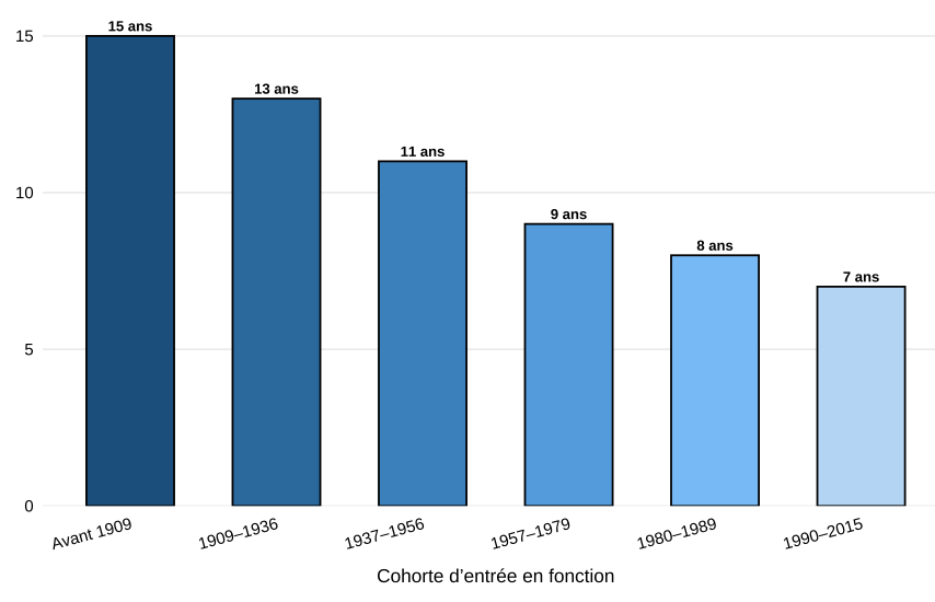 Notre analyse montre que la durée des mandats des élites diminue de huit ans au fil du temps. Les baisses les plus importantes ont lieu au début, entre les premières cohortes entrées en fonction. Sur l’ensemble de la période, la durée des mandats diminue continuellement, jusqu’à sept à huit ans dans les cohortes les plus récentes. Dans la dernière cohorte entrée en fonction entre 1990 et 2015, 92 (sur 476) dirigeants économiques sont toujours en fonction, et il est donc probable que nous sous-estimions légèrement la durée du mandat de cette cohorte.