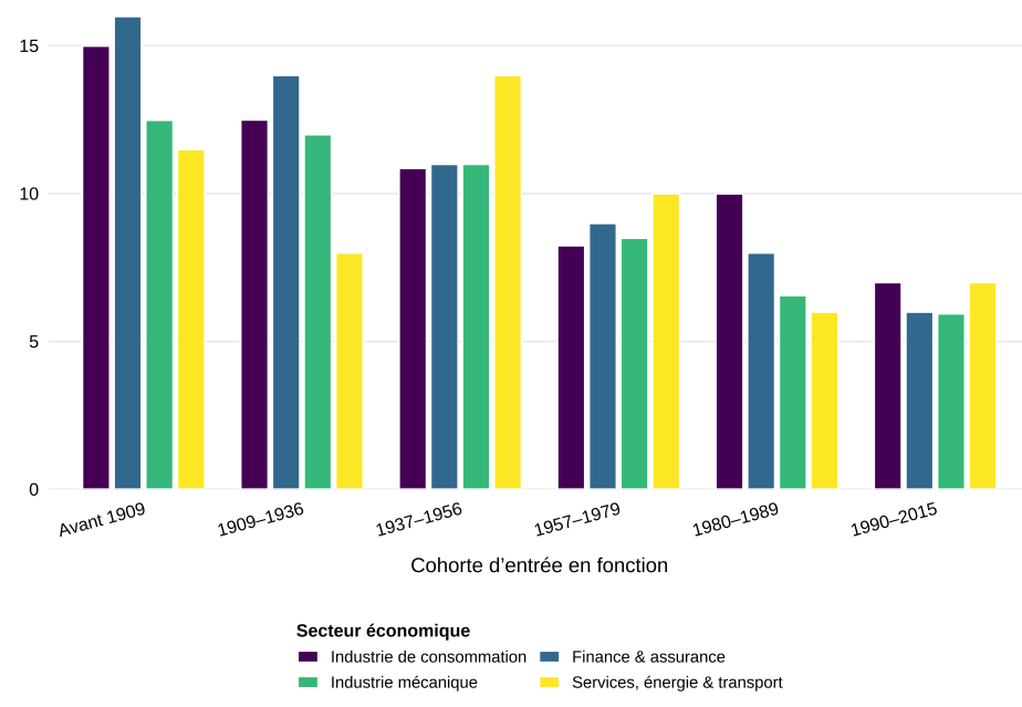 L’analyse montre également que l’évolution de la structure économique ne joue pratiquement aucun rôle. La durée du mandat de l’élite ne s’explique pas par des changements sectoriels, car dans la plupart des secteurs, la durée du mandat diminue au même rythme. Les secteurs en plein essor, comme le secteur financier, n’ont pas des mandats plus courts que les secteurs en déclin, comme l’industrie mécanique.
