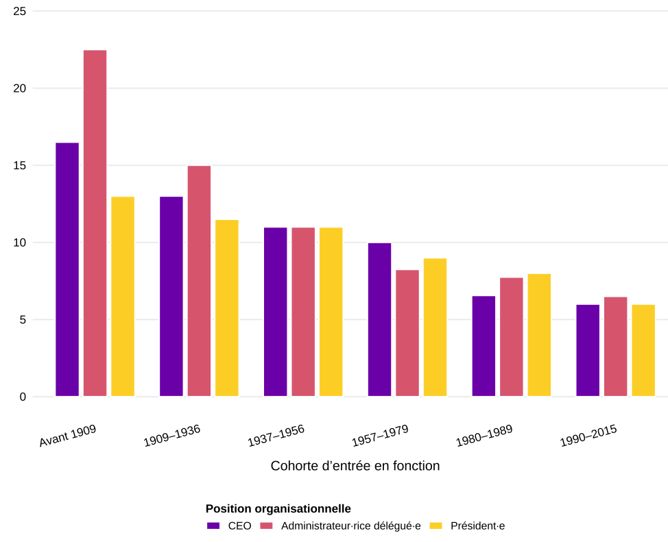 Ce qui compte, c’est l’évolution historique. Même si les changements ne se sont pas produits du jour au lendemain, certaines observations sont révélatrices : le raccourcissement des mandats a commencé dès la première moitié du XXe siècle. Il est donc probable que l’introduction de plans de retraite obligatoires ou le déclin du capitalisme familial – phénomènes qui ont commencé dès le milieu du XXe siècle – aient contribué à raccourcir la durée des mandats. C’est ce qu’indiquent également les différences entre les différentes fonctions de direction dans les entreprises.