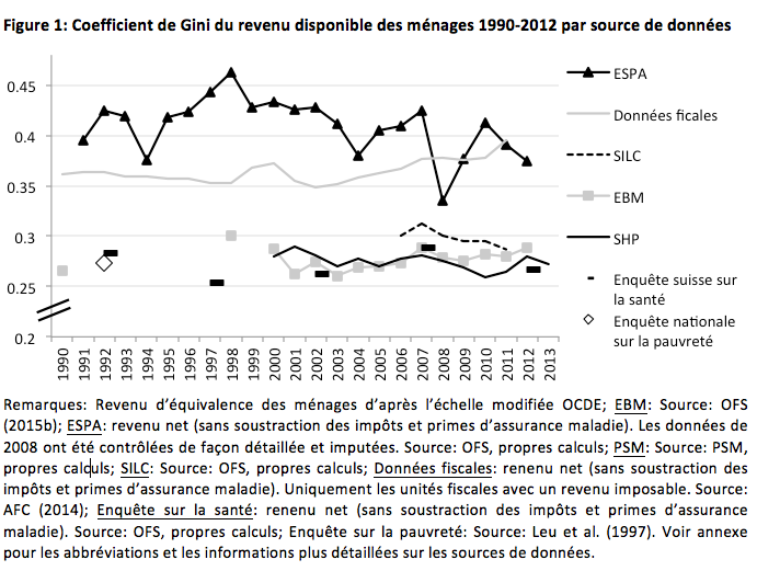 *Cet article a été élaboré dans le cadre du projet du Fonds national “Income and wealth inequality, deprivation and wellbeing in Switzerland, 1990–2013” (Projet 100017_143320). Nous aimerions remercier l’Office fédéral de la statistique (OFS) pour la mise à disposition des données. Cette étude a aussi été réalisée grâce aux données du Panel suisse de ménages (PSM), qui est dirigé par FORS, le Centre de compétence suisse en sciences sociales. Cet article se base en grande partie sur la publication plus complète “Considering the various data sources, survey types and indicators: To what extent do conclusions regarding the evolution of income inequality in Switzerland since the early 1990s converge?“, que nous avons co-rédigée avec nos collègues Pascale Gazareth, Eric Crettaz et Laura Ravazzini (Suter et al., à paraître). Nous les remercions chaleureusement ainsi que Jehane Simona et Gian-Andrea Monsch pour leur soutien et leurs précieux commentaires.